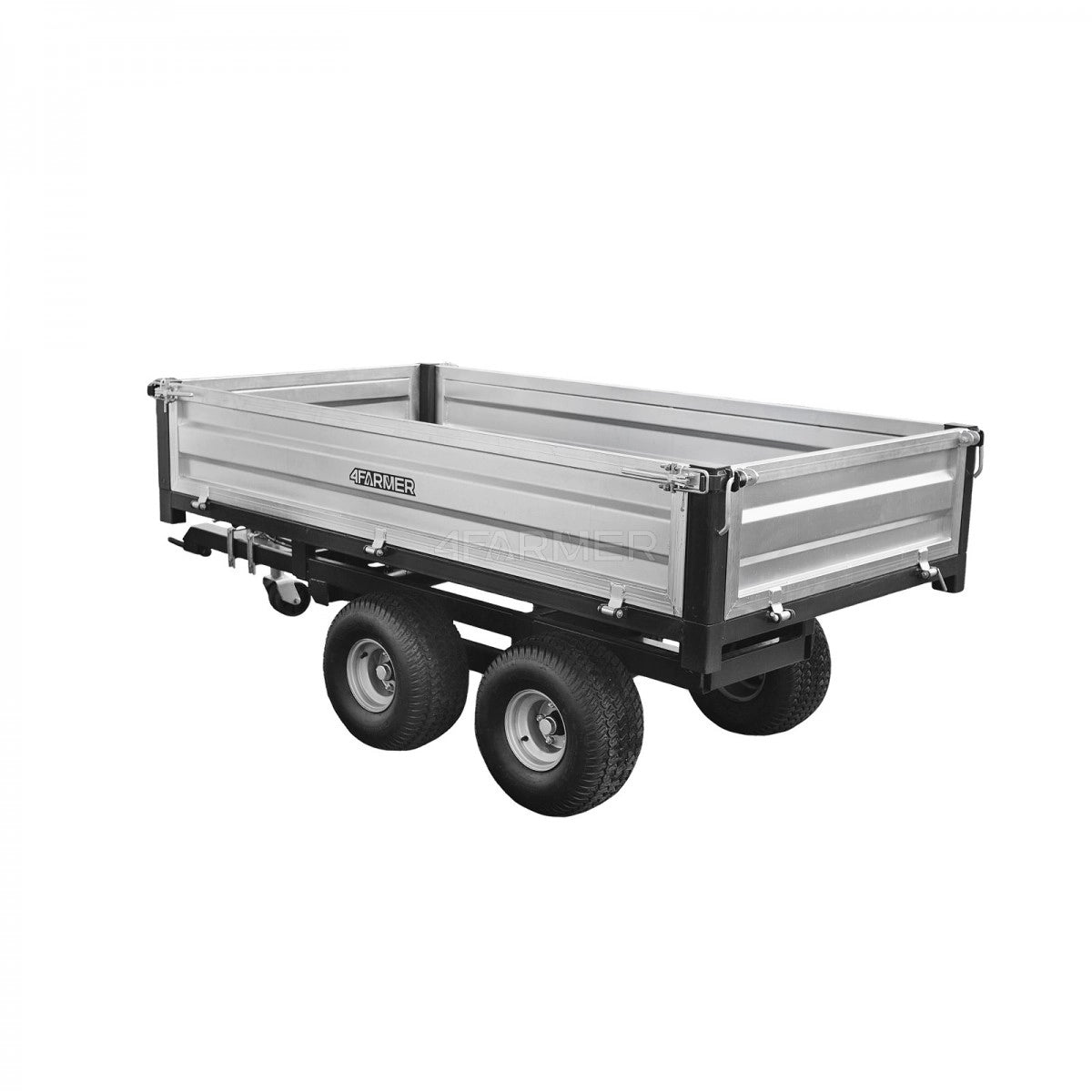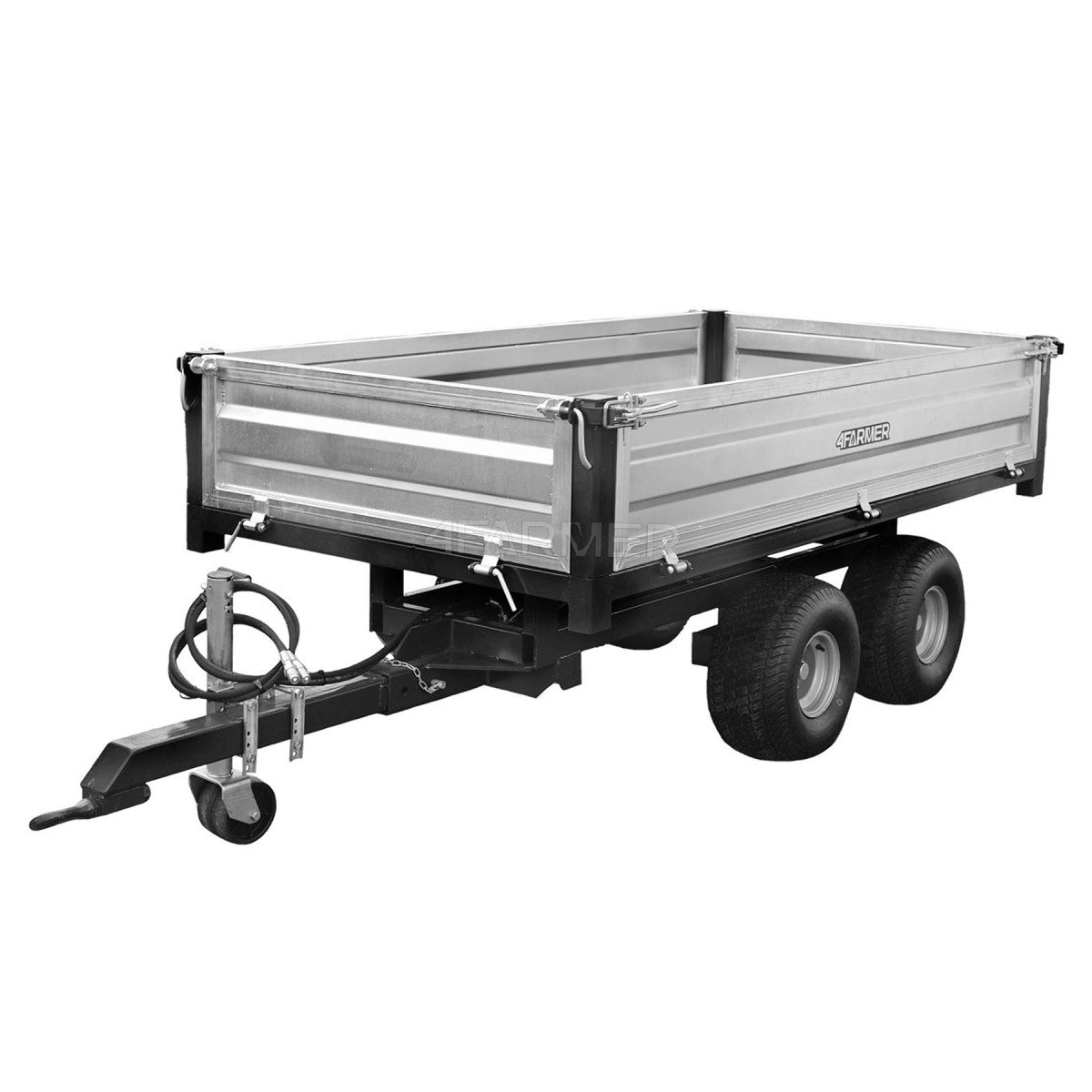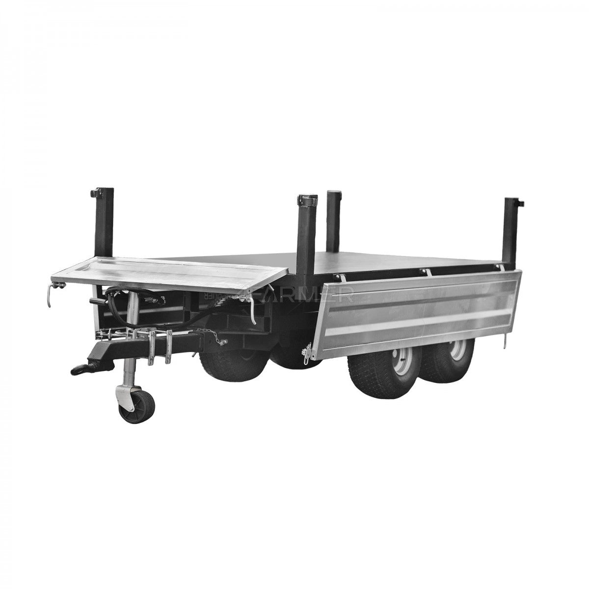 Rimorchio agricolo molto robusto, zincato, a due assi con asse montata centralmente sulla piattaforma e portata massima consentita di 2,5 tonnellate, con ribaltamento posteriore. Si adatta perfettamente sia all’uso agricolo che ai lavori comunali più impegnativi. Inoltre, il rimorchio è dotato di sponde rimovibili.
