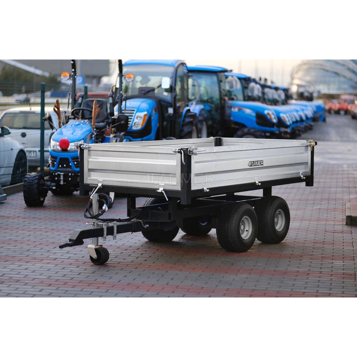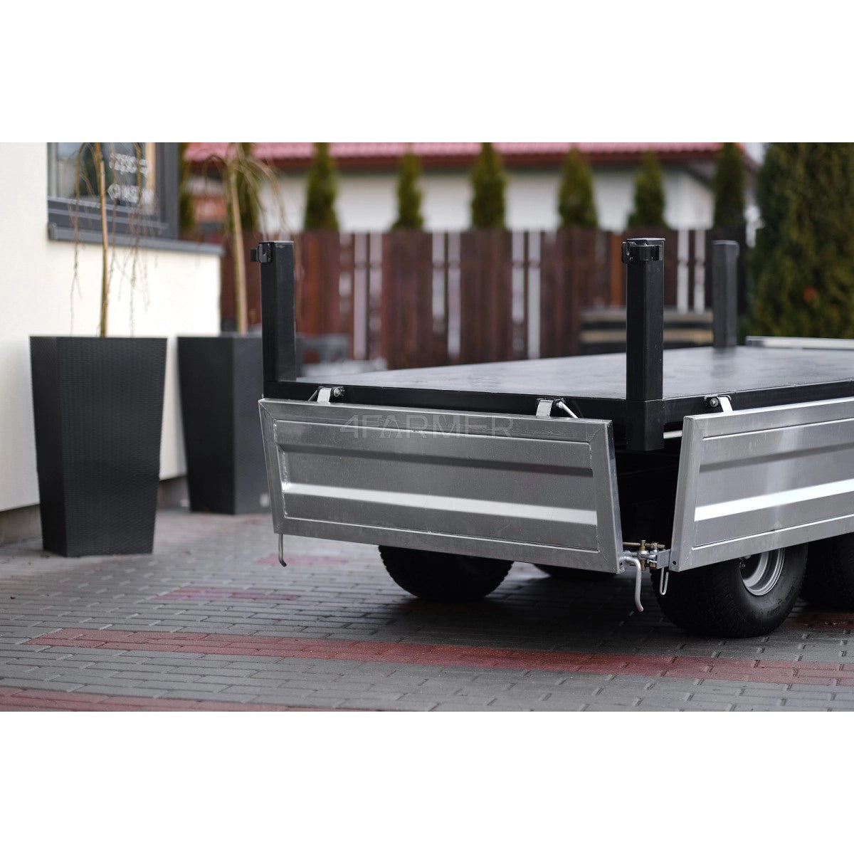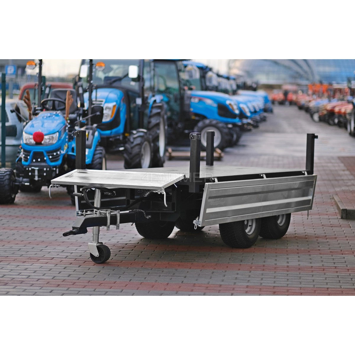 Rimorchio agricolo molto robusto, zincato, a due assi con asse montata centralmente sulla piattaforma e portata massima consentita di 2,5 tonnellate, con ribaltamento posteriore. Si adatta perfettamente sia all’uso agricolo che ai lavori comunali più impegnativi. Inoltre, il rimorchio è dotato di sponde rimovibili.